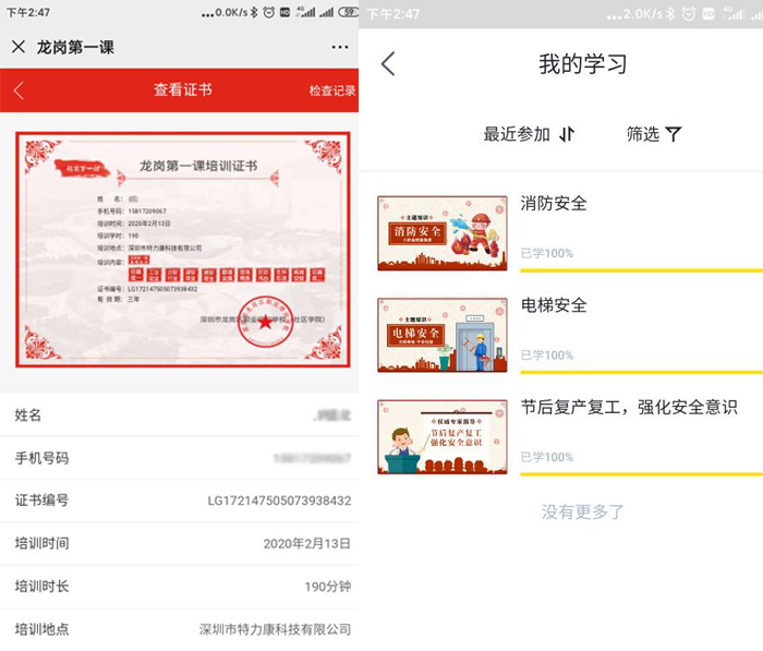 另外,防控期間為確保復(fù)工安全,我司全員進行了“龍崗第一課學(xué)習(xí)平臺”的培訓(xùn)及“強安APP”的《節(jié)后復(fù)產(chǎn)復(fù)工,強化安全意識》的學(xué)習(xí)、考試、考證。