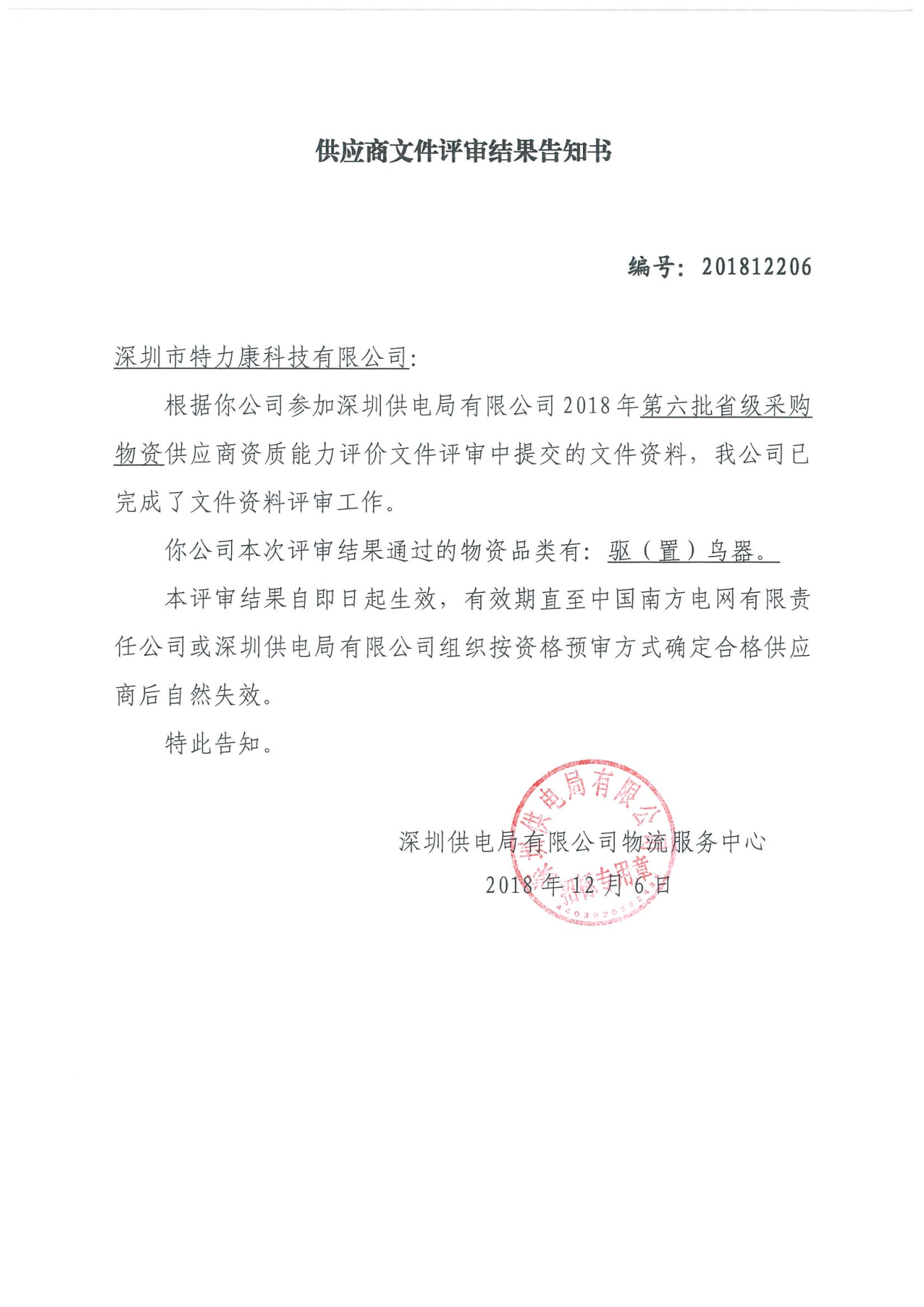 南方電網(wǎng)深圳供電有限公司2018年第六批驅(qū)(置)鳥器框架項目評審工作已結(jié)束,經(jīng)評審委員會評審,經(jīng)南網(wǎng)深圳電力公司招投標(biāo)領(lǐng)導(dǎo)小組批準(zhǔn),我司被確定為此次驅(qū)(置)鳥器框架中標(biāo)單位現(xiàn)將公告公示。
