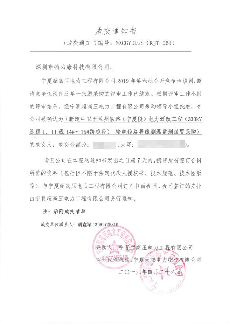 寧夏超高壓局2019年第六批公開競爭性談判電力遷改項目評審工作已結(jié)束,經(jīng)評審委員會評審,經(jīng)寧夏超高壓局招投標領(lǐng)導(dǎo)小組批準,我司被確定為此項目簽約單位現(xiàn)將公告公示。
