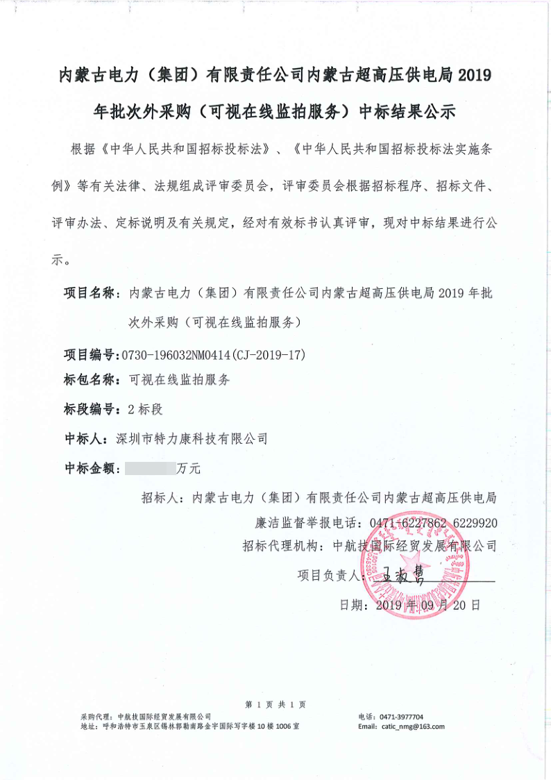 經(jīng)審委員會(huì)根據(jù)招標(biāo)程標(biāo)次評(píng)審、定標(biāo)說明及有關(guān)規(guī)定,經(jīng)對有效標(biāo)書認(rèn)真評(píng)審,確定我司為內(nèi)蒙古電力(集團(tuán))有限責(zé)任公司內(nèi)蒙古超高壓供電局2019年批次外采購(可視在線監(jiān)測服務(wù))項(xiàng)目中標(biāo)單位。