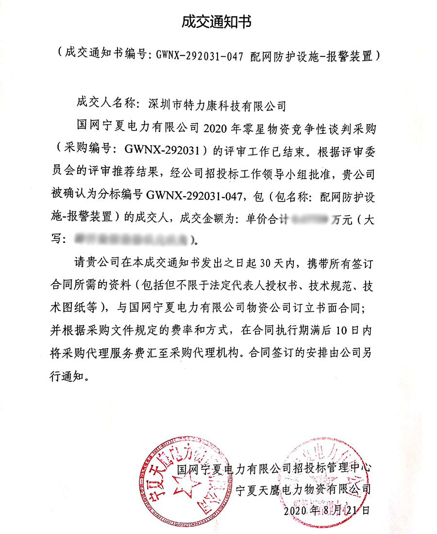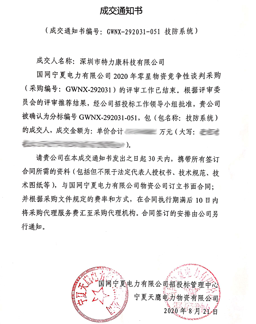 國網(wǎng)寧夏電力有限公司2020年零星物資競爭性談判采購(采購編號: GWNX-292031)的評審工作已結(jié)束。根據(jù)評審委員會的評審?fù)扑]結(jié)果,經(jīng)招投標(biāo)工作領(lǐng)導(dǎo)小組批準(zhǔn),我司(深圳市特力康科技有限公司)被確認(rèn)為分標(biāo)編號GWNX-292031-047,包(包名稱:配網(wǎng)防護(hù)設(shè)施-報(bào)警裝置)及分標(biāo)編號GWNX-292031-051,包(包名稱:技防系統(tǒng))的成交人,現(xiàn)發(fā)布成交通知書如下: