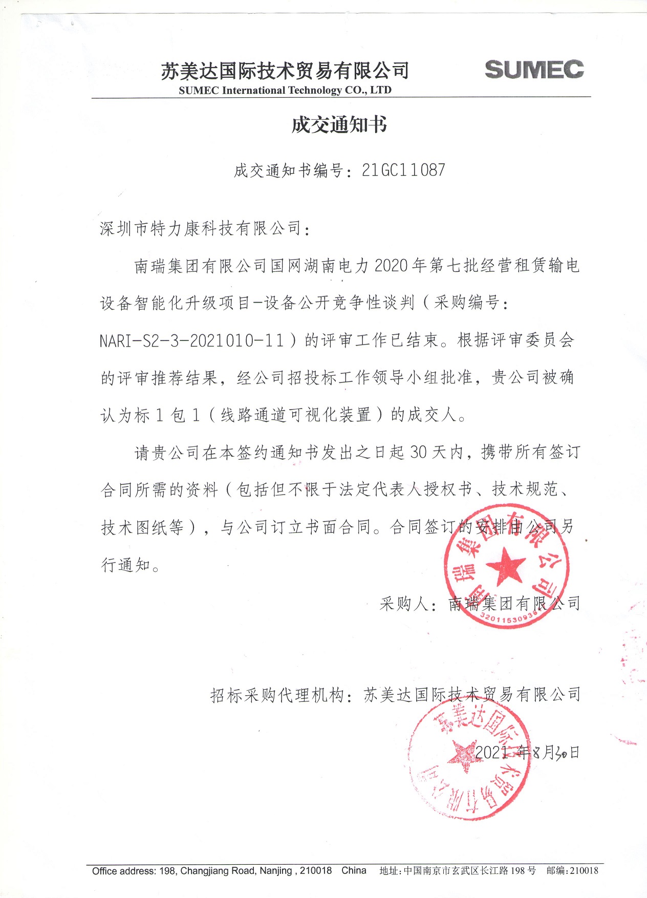 南瑞集團有限公司國網(wǎng)湖南電力2020年第七批經(jīng)營租賃輸電設(shè)備智能化升級項目-設(shè)備公開競爭性談判(采購編號:NARI-S2-3-2021010-11 )的評審工作已結(jié)束。根據(jù)評審委員會的評審推薦結(jié)果,經(jīng)公司招投標工作領(lǐng)導小組批準,我司被確認為標1包1 (線路通道可視化裝置)的成交人。中標公告如下:
