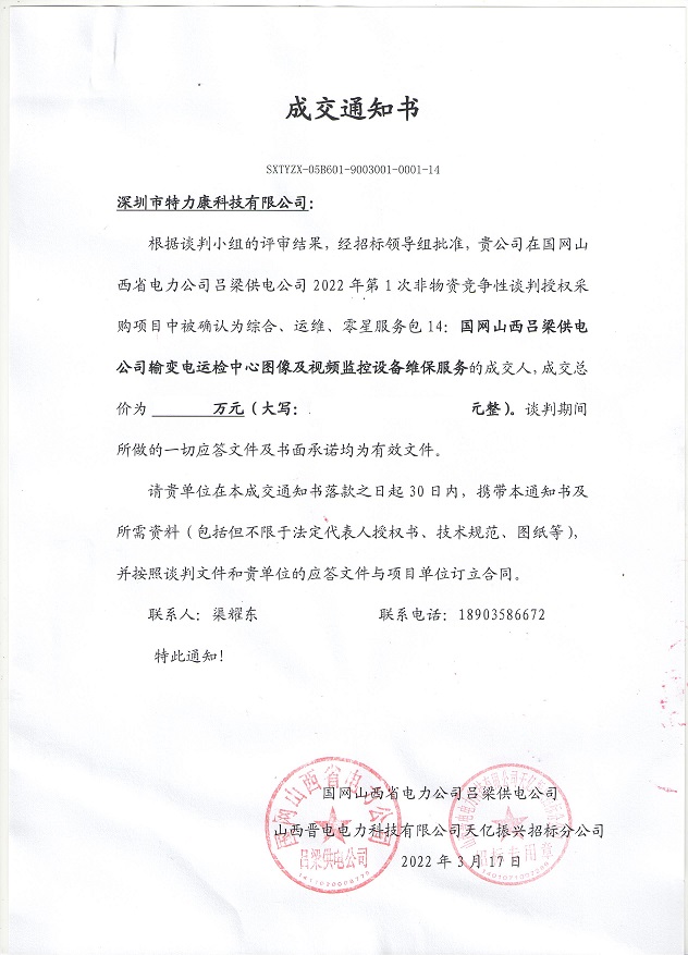 根據(jù)談判小組的評審結(jié)果,經(jīng)招標(biāo)領(lǐng)導(dǎo)組批準(zhǔn),貴公司在國網(wǎng)山西省電力公司呂梁供電公司2022年第1次非物資競爭性談判授權(quán)采購項(xiàng)目中被確認(rèn)為綜合、運(yùn)維,零星服務(wù)包14:國網(wǎng)山西呂梁供電公司榆變電運(yùn)檢中心圖像及視頻監(jiān)控設(shè)備維保服務(wù)的成交人,中標(biāo)公告如下: