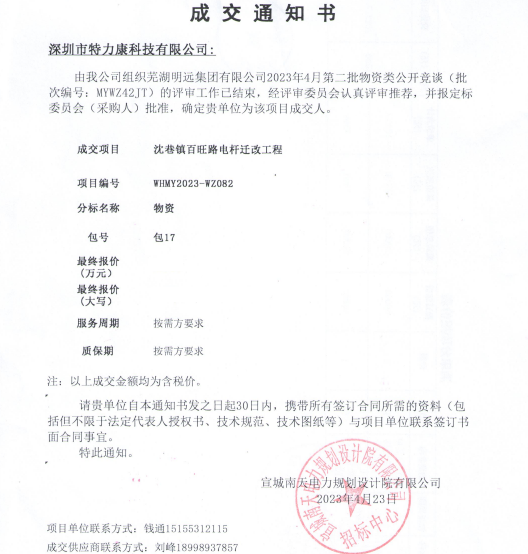 特力康中標蕪湖明遠集團有限公司2023年4月第二批物資類公開競談成